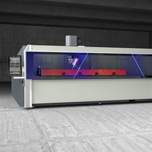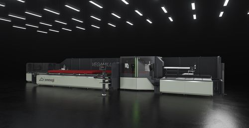 8- to 12-axis CNC machining and cutting-off centre, built for cutting, drilling and milling aluminium and light alloy profiles. Vegamill consists of four main units. Automatic belt loading magazine for profiles with a length of max. 7,500 mm. A high-precision and high-speed push-feed system with gripper for profile picking and conveying to a machining area. The adjustment of horizontal and vertical position of the gripper is manual; it can be optionally automated by means of an electronic positioning system on two controlled axes. The central machining unit with drilling and milling functions by means of 4-axis CNC and cutting unit, with widia blade. The cutting unit with 250 and 400 mm blade performs 90° cuts; in the version with 600 mm blade, it can perform cuts with an inclination of up to 22°30′ to the right and left, with the precision and efficiency of a brushless motor on CNC rotation axis with absolute magnetic band. The unloading unit may consist of a conveyor belt, ideal for short pieces such as brackets and hinges, or, alternatively, an unloading table equipped with an automatic extractor and an automatic tilting and translation system. The units making up VEGAMILL are protected by guards in such a way that they do not require additional enclosure guards, lending compactness and flexibility to this cutting-off and machining centre.