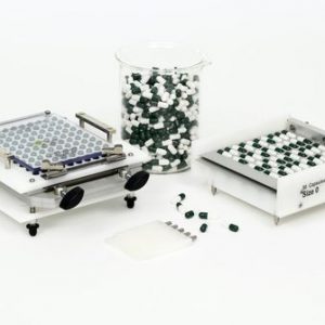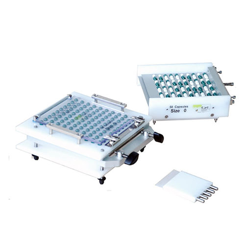 Pressure pushers in different sizes, and vibrating table PV 1 to facilitate the smooth and even descent of the powders into the capsules.