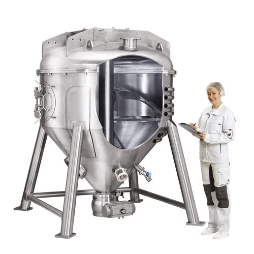 “Conical vertical dryer and powder dryer with ideal mixing quality. Quick and gentle drying for moist and viscous materials at variable filling levels. A spiral mixing blade inside the vertical dryer initiates a three-dimensional flow of the mixing goods; conical designed mixing vessel enables powders to be discharged up to 100%. The conical vertical dryer is vacuum and pressure tight and heatable by steam, thermal oil or water. Fully temperature controlled: the mixing vessel, the mixing arms, the spiral blade.