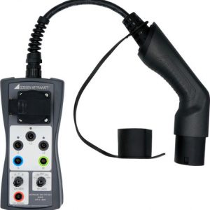 Single and 3-phase test adapter with type 2 plug for testing the effectiveness of protective measures at electric charging points with the Profitest Master. Simulation of fictitiously connected electric vehicles and simulation of current-carrying capacity per IEC 61851-1. Extended CP test pin for testing charging points with permanently attached charging cable.