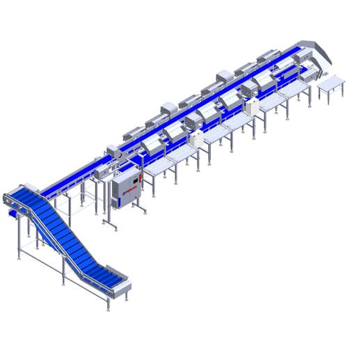 Product for grading is filled by operator on infeed Z-type conveyor – one product per pocket.