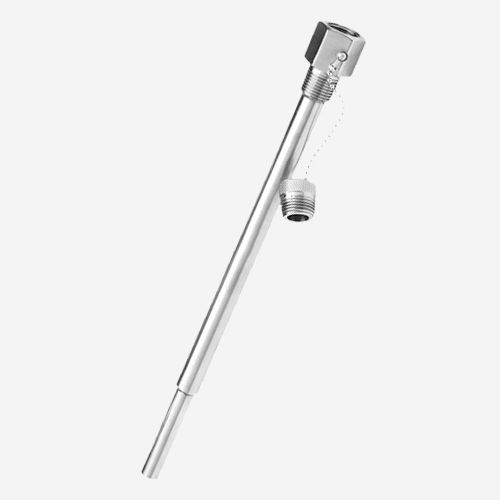 We recommend the use of a thermowell in conjunction with a bimetallic thermometer when the application involves a corrosive medium, high pressure, or high flow velocity. Perfect for applications requiring protection for unarmored liquid-in-glass test thermometers, or other temperature sensing elements with a maximum diameter of .25”.