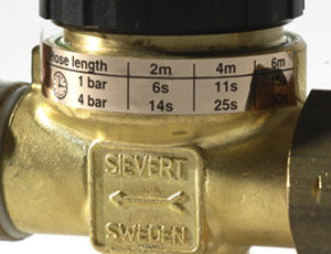 A hose failure valve improves safety by cutting off the gas flow in case of a hose rupture or some other major gas leak. The use of hose failure valves is especially recommended on long hoses. The hose connection rotate freely on the valve housing, which reduces the risk of the hose becoming entangled. Sievert hose failure valves are supplied separately (3054) or integrated in regulators (3063, 3083, 3092 and 3093).