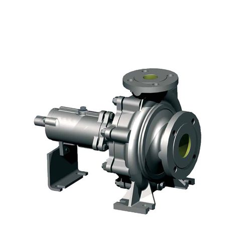 EACD pumps are designed for diathermic fluids having a max. temperature of 350°C. No cooling of the seal chamber is required; the installation of auxiliary flushing can then be avoided. Mechanical seal is in accordance with DIN 24960. These pumps, fitted with special mechanical seal device, can be used with hot water up to 170°C. Construction: EACD pumps, in bare shaft version, have a standard process type design: single stage, single volute casing; axial suction, top radial discharge; radial impeller, with axial thrust balancing holes; separate bearing housing, with one plane bearing lubricated by the pumped liquid and one grease lubricated axial thrust resistant ball bearing.