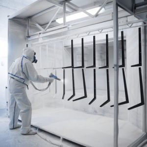 Powder painting is performed on a semi-automatic painting line using static application by corona. Powder particles are electrically charged using the electrostatic field, while the painted object is grounded. The resulting electrostatic force is sufficient to create an adequate layer of powder on the object. The powder remains on the place until it melts and adheres to the surface in a coherent layer.