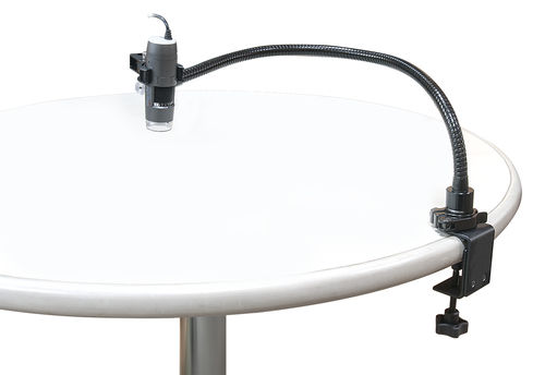 The RK-02 is a durable gooseneck stand solution designed for flexible and versatile usage with a Dino-Lite digital microscope. The C-clamp of the RK-02 fits to virtually any surface of up to 7 cm (~3 inch) thick, and can be mounted horizontally or vertically. With this sturdy stand, you can easily position the Dino-Lite by bending the 60 cm long arm and adjusting the rotating head. The base of the RK-02 can also be rotated providing even more freedom and it can be fixed with the quick release fastener for use on uneven surfaces. The RK-02 gooseneck arm is the ideal choice to flexibly use any of the Dino-lite models, except the high magnification models.
