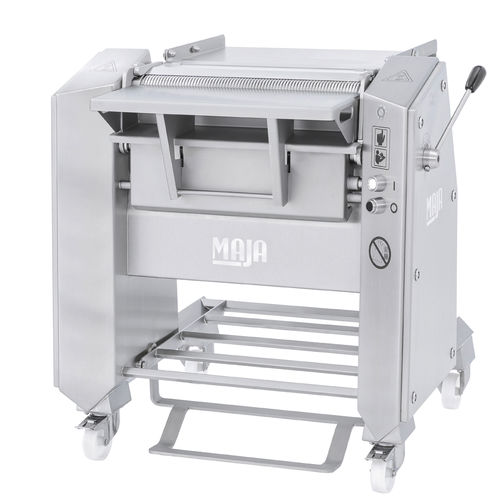 Open derinding machines for manual processing of round pieces of meat, especially for the meat industry.
