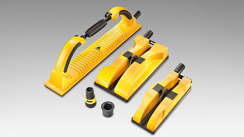 Compatible, fully integrated system including files, blocks with suction hose and fasteners. The complete range of hand sanding tools is noted for its low weight combined with anatomically shaped handles for comfortable sanding. Direct and even transfer of pressure to the workpiece at all times.