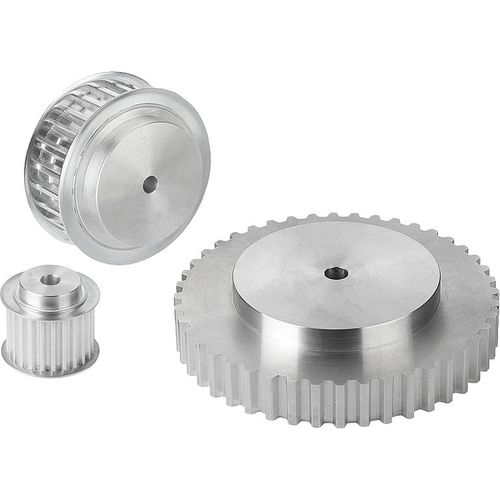 Standard T-profile to DIN 7721 T2 with metric pitch (trapezoidal toothing). At least one toothed belt pulley must have rim flanges. The toothed belt pulleys have a centre or pilot hole.