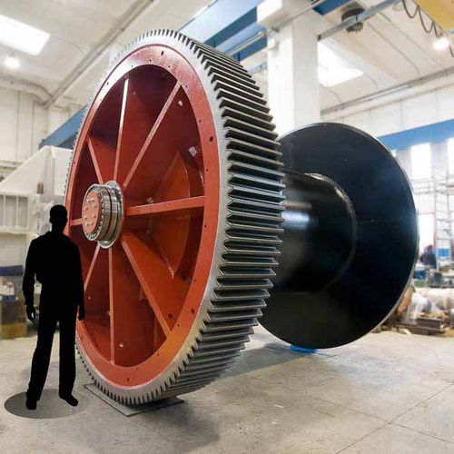 Submarine-cable laying winches drum NiCrMo steel ring gear, module 25, 3800 mm outer diameter, 50-52 HRc induction hardened teeth profile, solidly fitted on drum electrowelded frame, specifically manufactured with low temperature high resistance carbon steel (North Sea installation).
