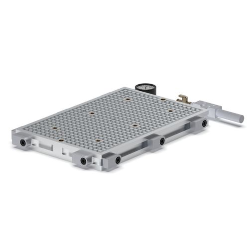 The integrated threaded grid holes and the workpiece stops provide great flexibility in positioning the workpiece to be machined. For milling of breakthroughs is the use of adapter mats necessary.