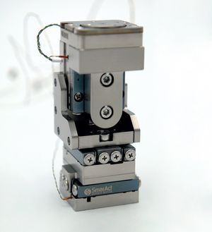 The central component of any XYZ positioning system is a linear stage. In this example, an SLC-1720-CR. Three stages can be easily combined with holders and adapter plates to form compact multi-axis setups, which are usually connected to the cold finger of a cryostat in the customer setup.