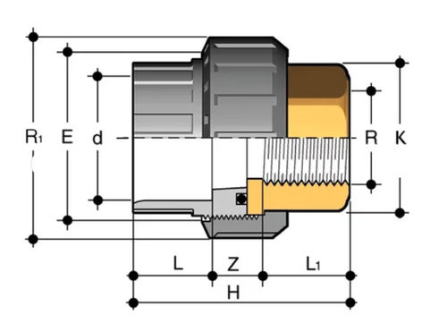 Adaptor union in PVC-U/brass with solvent weld socket d and BSP threaded brass female end R with O-Ring in EPDM.