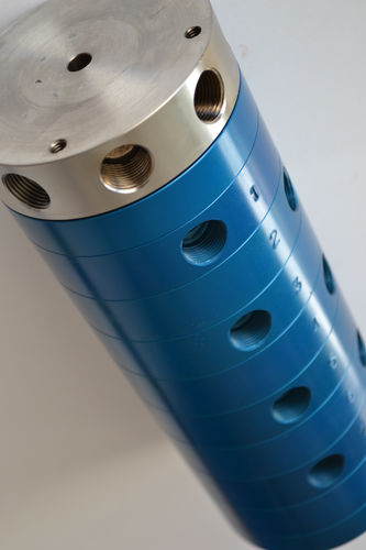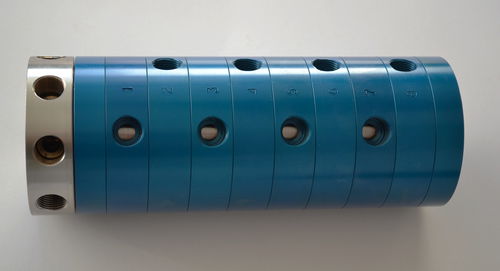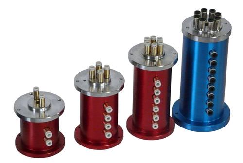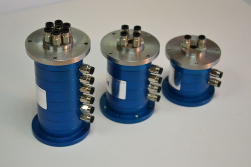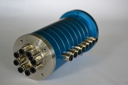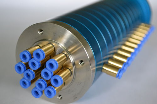 A multi passage rotary Union is a machine element, making it possible to feed several mediums (compressed air, water, cooling fluids, vacuum…) from a stationary line into a rotating machine section.