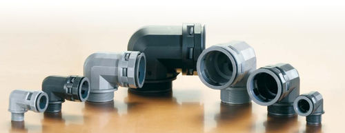 90° elbow fitting with male metric thread according to EN 60423 for fixing the ends of flexible corrugated conduits to the cable entries on control panels, terminal boxes on electric motors, etc., in accordance with standard EN 60204 (Safety of Machinery). They are notable for their high tensile strength and tightness