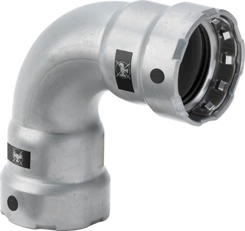 Flow-​optimised press connector system made of non-​alloy steel 1.0308 with an externally galvanised zinc-​nickel coating for black, galvanised, industrially painted and powder-​coated steel pipes. Press connectors with stainless steel cutting ring to ensure the mechanical strength of the connection. Suitable for concealed and pre-​wall installations of riser pipes and floor installations.