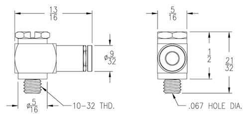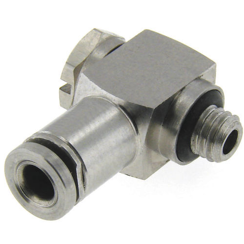 Adjustable position 90 degree elbow fitting, from 10-32 external thread to 1/8″ OD tubing