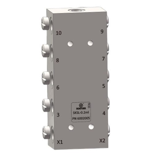 For Progressive Lubrication Systems Type SSVL distributors are single block progressive distributors with larger pipe diameters for heavy industrial applications. Can be used with pin indicators for visual system monitoring or piston detectors for electrical system monitoring. Port combinations are available with 2, 3, 4 and 5 ports.