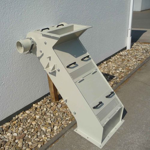 The AirVibe 2 is vibrating with a linear stroke using 2 unbalanced motors. This motion is important for the transport, fluidization and even distribution of the infeed material. An adjustable air knife, positioned at the end of the impact area blows through the material stream. Light material particles like paper, plastic and card board are blown into the expansion room of the AirVibe 2 and discharged at the light material fraction of the end of the AirVibe 2. The medium weight particles which were not separated in the first separation stage based on size and shape hit an adjustable sepa­ration plate. Especially light particles with a larger surface area and those with a higher grip will be moved over the separation plate due to the linear stoke of the machine and added to the light material fraction. Round, rolling particles and those with a smooth surface like stones and glass are sliding down the separation plate and added to the heavy material fraction.