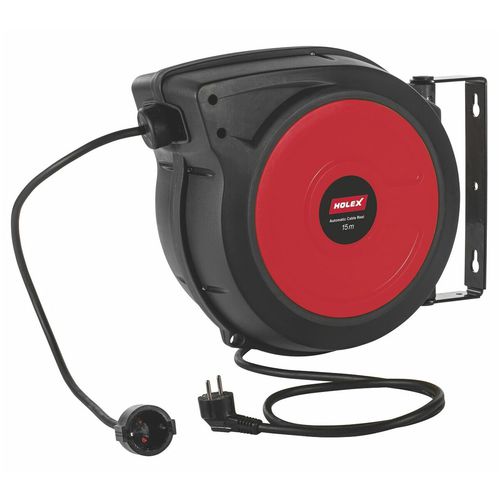 Cable reel with guided automatic draw-in and roll-up, with multiple stop points per revolution. Impact-resistant enclosed plastic housing. Thermal overload cut-out, sturdy H07RN‑F neoprene cable with connection point.