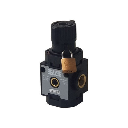 Manual lockable valve, 3 way, 2 position. In the close position it enables to discharge air pressure. In the closed position possibility to block with padlock. Modular system with kit assembly