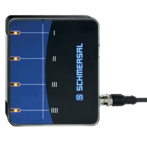 The SSB-R sensor box detects the field of suitable actuator magnets on four independent tracks and switches the signal status on pass-by. This level change, which occurs on rapid pass-by, is retained until the next activation, i.e., retentively. A connected control unit uses the signals to determine the position and section of the sensor box and controls, for example, the speed or holding positions of the drive motor.