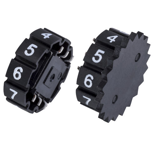 Reflow solderable thumb wheel switch for mounting in slim housings. It is especially designed for adressing in BUS- and wireless-applikations in slim DIN-rail housings. The thumb wheel is permanently connected to the rotary code switch and it makes adjustments and legibility of the rotary code switch very easy.