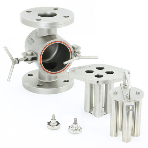This robust magnetic filter is suitable for industrial applications where liquid mixtures and powders are transported in pressure pipes up to 10 bar.