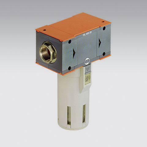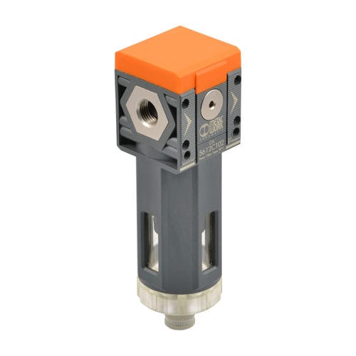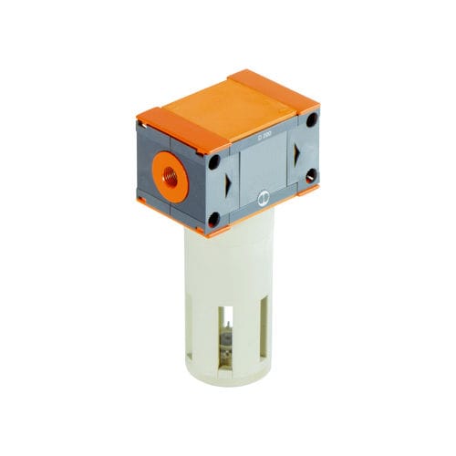 The Job of the filter is to remove any solid or liquid impurities from the air generated by the compressor. Incoming air is rotated by the centrifuge unit. The heaviest liquid and solid particles are projected against the walls of the container and forced to adhere to it. As they accumulate they form drops that deposit on the bottom by gravity. The remaining solid particles are held back by the porous element depending on the filtering threshold. The accumulated condensate is drained out through the drain – automatically when there is no pressure in the filter, or by hand pressing the button. An automatic drain is available. It automatically eliminates condensate from the container whenever necessary, whatever the pressure.The transparent windows allow to view the level of condensation at 360°