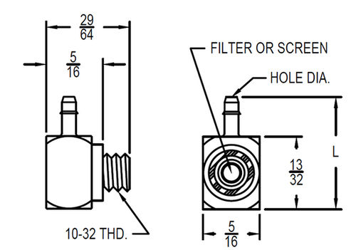 Low profile, adjustable position elbow with 10-32 or M5 thread and built-in barb. A porous sintered filter or wire mesh screen is pressed into the external threaded end of the fitting.
