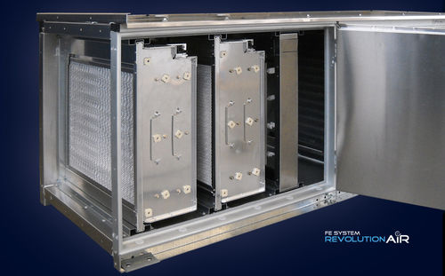 With the constant increase in atmospheric pollution, especially in the most industrialised countries, the demand for air filtration is growing sharply. In the context of sustainable development, the need to minimise the power consumption of plants has become of fundamental importance and is being widely researched. The new range of active electrostatic filters with integrated electronics, the FE SYSTEM series, has been designed and developed for this reason. Electrostatic filter FE SYSTEM is an alternative to traditional pocket filter and was designed to simplify the use of electrostatic filters in AHUs and Rooftops. Its use in ventilation systems, particularly in the air-conditioning sector, does not require changes in the construction and dimensional characteristics of the plant.