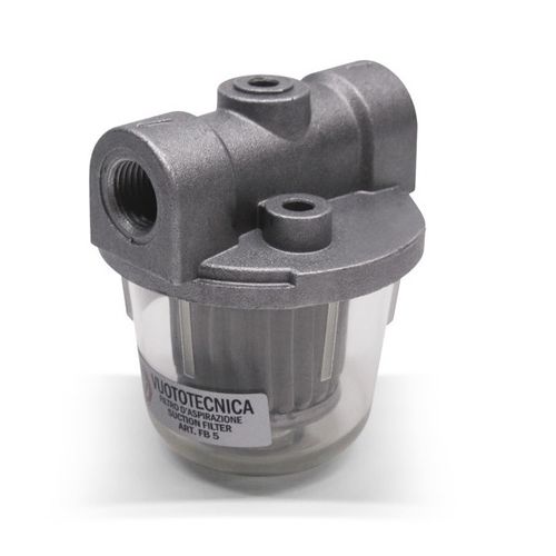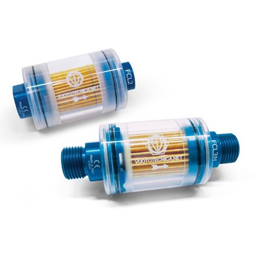 They are composed of a cylindrical transparent Plexiglass body closed by two anodised aluminium flanges kept in place by Seeger rings, where all the threaded male or female connections and seals are located. Inside there is a filtering cartridge with a filtering degree equal to 7 μ, which is made with a special treated paper that is pleated to increase the filtering surface. The filters can be inspected by simply removing one of the two flanges. Due to the paper filtering element, these filters are not recommended in presence of water or oil vapours or condensations.