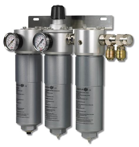 Sinterised brass 8 micron pre-filtration is incorporated, followed by a 0.01 micron coalescent filter and final filtration by a wide surface active charcoal filter. In addition/ to water and impurities, this process eliminates organic fumes and foul air.