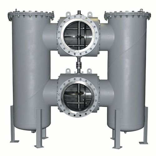 The single filter consists of a cast or welded body, cover and filter insert. The filter insert is a basket strainer made of perforated sheet metal covered with a mesh made of different materials and mesh sizes. The medium to be filtered enters the filter from above, generally flowing through the insert from the inside outward. Impurities are caught in the strainer insert, accordingly.