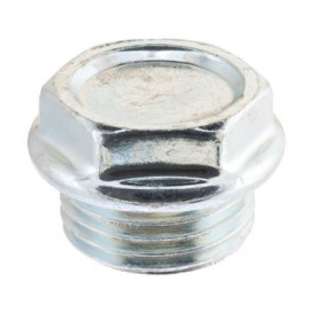 Screw plug with hexagon head flanged design, cold formed made of zinc plated steel. Main applications: radiators and compressors.