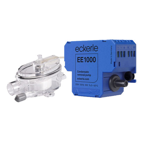 The EE1000 comprises a pump and a float module. The three-stage float switch controls the pump. If the maximum permissible level of condensate is exceeded, the float triggers an alarm. The float module is connected directly to the outflow pipe of the condensate vessel or to the end of the outflow line. The supplied package includes the pump, float switch, the vibration dampers and fastening materials.